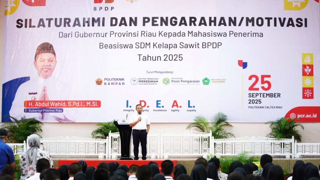 PROVINSIRIAU.com | Pekanbaru, 26 September 2025 – Gubernur Riau, Abdul Wahid, menyampaikan apresiasi setinggi-tingginya kepada pemerintah pusat melalui BPDP atas perhatian besar terhadap generasi muda Riau. Dalam arahannya di Politeknik Caltex Riau pada Kamis (25/9/2025), Gubernur menegaskan bahwa beasiswa ini harus dimanfaatkan sebaik-baiknya sebagai modal berharga untuk meraih prestasi dan berkontribusi bagi daerah.